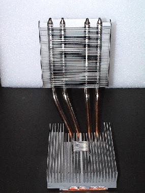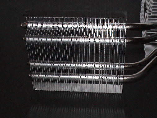 Auf jeden Fall macht die Heatpipe, deren unteres Kühlerauflager aus Kupfer besteht, einen verarbeitungstechnisch sehr guten Eindruck. Kein Ruckeln und Ziehen kann die Konstruktion dazu bewegen sich auch nur einen Millimeter zu verschieben. Sehr gut verarbeitet, hervorragende Materialien und präzise gearbeitete Einzelteile : Der erste Eindruck (abgesehen vom Lüfter) ist ne glatte "Eins".