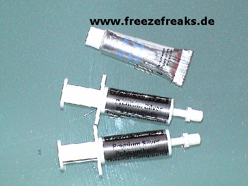 auf dem Bild seht ihr die Mindestausstattung : Spritze mit Silikon (unten links), Wärmeleitpaste (Anti-elektrisch!!), Silberwärmeleitpaste Artic Silver III. Zu diesen Komponenten gibts auf der Einkaufsliste nochmal genau Erläuterungen.