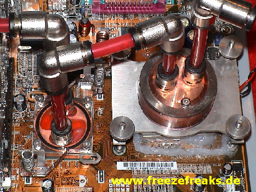 Auch dieser Punkt ist wichtig. Falls Kondenswasser entstehen sollte, müssen wir ja alles tun, um es vom Sockel und dem Prozessor wegzubekommen. Das Auffanfbecken ist sicherlich nur bei waagrechten Boards nötig, aber bei senkrecht eingebauten Boards würde ich genauso eine "Triefnase" und eine Beschichtung des Boards unterhalb des Sockels in Fließrichtung des Wassers anraten...