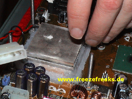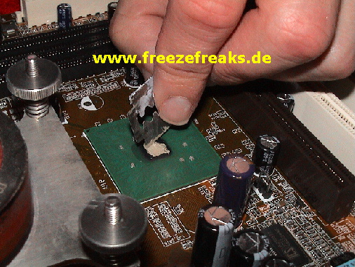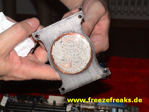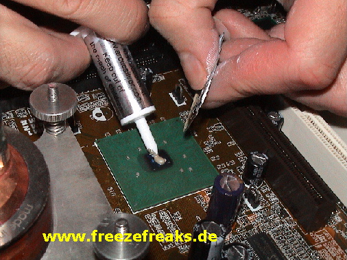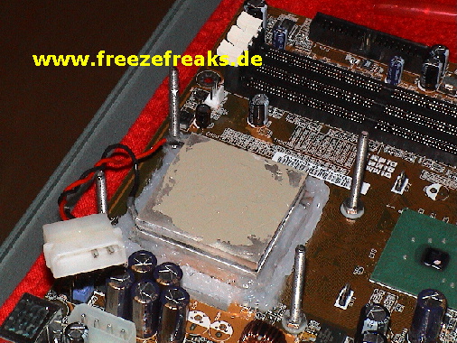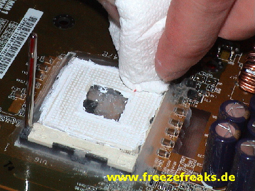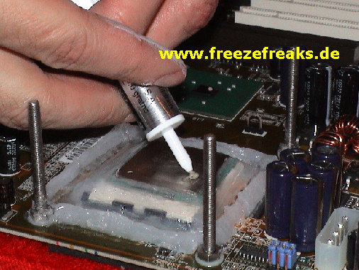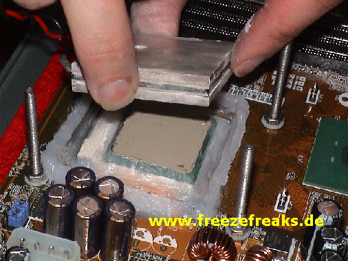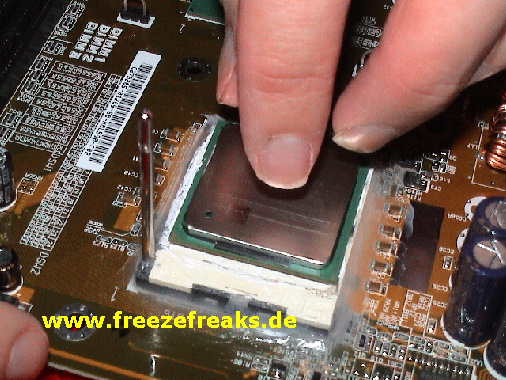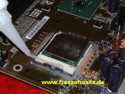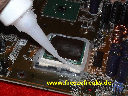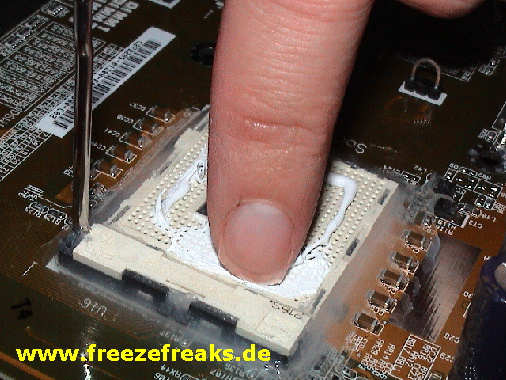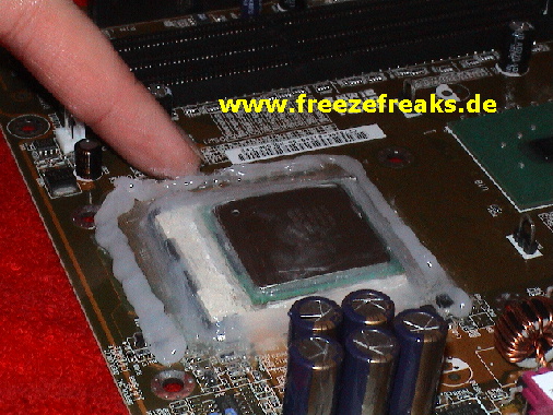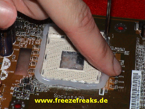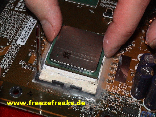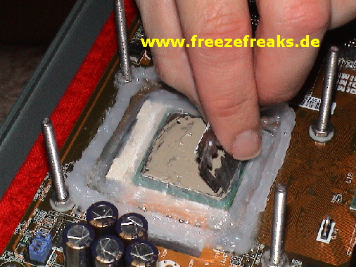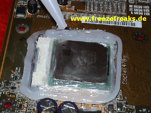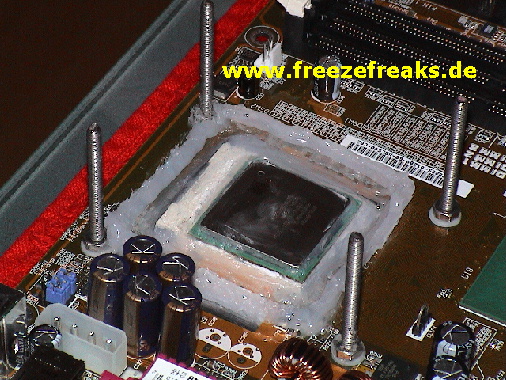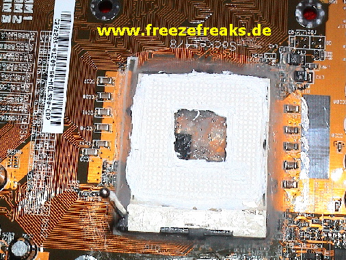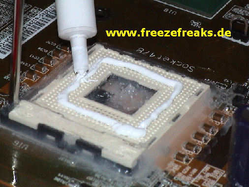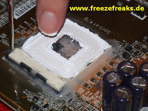 Dieser Arbeitsgang ist enorm wichtig. Er verhindert die mögliche Bildung von Kondenswasser im Sockel an den PINS der CPU. Wer hier schludert oder diesen Arbeitsgang asulässt => Selber schuld, aber schickt mir Eure Bilder der abgrauchten CPUs doch bitte zu, ich suche immer warnende Beispiele... (Dieser Arbeitsgang ist auch beim Prometeia und Vapochill ein absolutes MUß!)