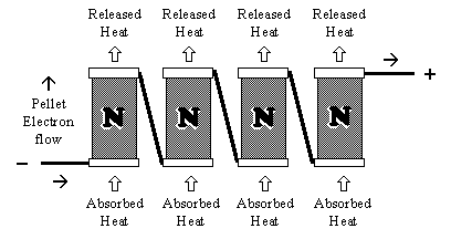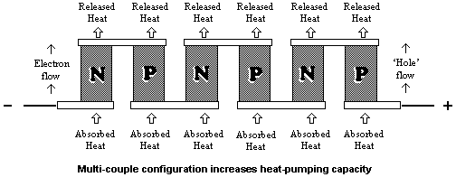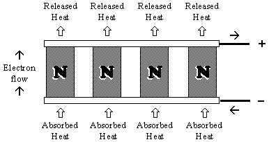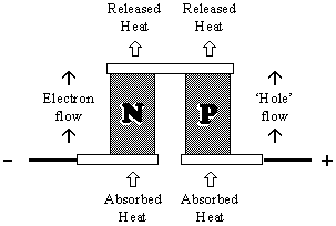 Durch die paarweise Anordnung von N und P Typen-Kügelchen und kreuzweisen Anordnung der Typen zueinander (auf einer Kupferplatte) ist es möglich, ein Modul so zu konstruieren, das es die Wärme immer in ein und dieselbe Richtung transportiert. Wie auf der Zeichnung unten zu erkennen ist, findet auf der Unterseite des Elements ein interessantes Phänomen statt: Am positiven Spannungspotential des P-Typs und dem negativen Spannungspotential des N-Typs werden die jeweils die positiven Ladungsträger im P-Material vom positiven Spannungspotential abgestoßen und vom negativen Pol angezogen; die negativen Ladungsträger (Elektronen) im N-Typ werden ebenso vom negativen Pol abgestossen und vom positiven Pol der Spannungsversorgung angezogen. In der Kupferplatte und den elektrischen Leitungen sind die Elektronen die Ladungsträger und sobald diese den P-Typ erreichen, fließen sie einfach durch die "Löcher" innerhalb der Kristallstruktur